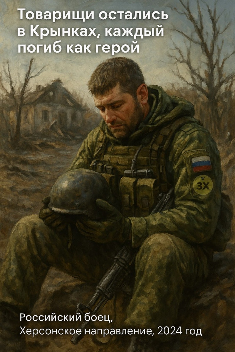 «Три дня в Крынках» - история бойца «Тайги» Текст основан на реальных событиях, сентябрь–ноябрь 2023 года, Херсонское направление, село Крынки Его позывной «Тайга». Настоящее имя Александр, 33 года, родом из подмосковного Ногинска. До СВО электрик, отец двух дочерей. В зону боевых действий попал по контракту в начале апреля 2022 года, а осенью 2023-го оказался в эпицентре самых ожесточённых боёв на левом берегу Днепра в Крынках. Крынки - это небольшое село, которое за считанные месяцы стало символом ожесточённого сражения за каждый метр земли Херсонской области. В октябре 2023 года ВСУ предприняли серию высадок на противоположный берег, пытаясь закрепиться на плацдарме и прорвать российскую линию обороны. Российские войска приняли удар на себя в буквальном смысле стоя по грудь в воде под дождём из дронов и мин. «Тогда мы стояли на третьей посадке», - вспоминает Тайга. «Была ночь. Над головами гудели FPV, мины ложились по 5 штук в минуту. Но мы держались. Потому что за нашими спина