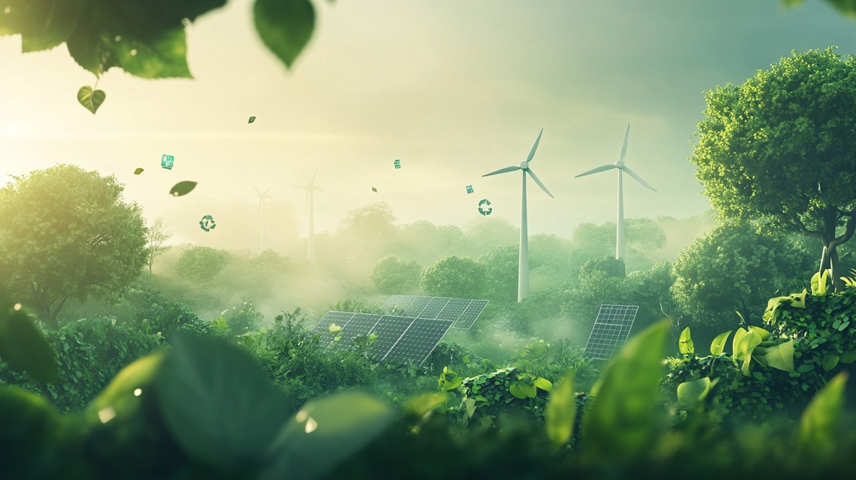 Создано на основе запроса: an eco-friendly scene with natural elements like trees, leaves, solar panels, wind turbines, and recycling