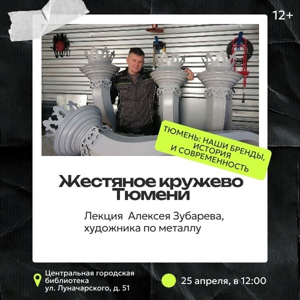 Лекция Алексея Зубарева «Жестяное кружево Тюмени» 25 апреля в 12:00 в Центральной городской библиотеке (ул. Луначарского, 51) в рамках проекта «Тюмень: наши бренды, история и современность» состоится лекция Алексея Зубарева «Жестяное кружево Тюмени». Проект создан с целью популяризации исторического наследия Тюмени, её достопримечательностей и формирования гражданской ответственности за свою малую родину. Он объединяет деятелей культуры, связанных с развитием локальной идентичности, истории и культуры города Тюмени. Алексей Зубарев, мастер жестяного кружева, чьи работы украшают старинные дома в центре Тюмени. Работы Алексея не только сохраняют культурное наследие Тюмени, но и добавляют в её облик неповторимую красоту, становясь яркой частью городской истории. Деревянные дома, украшенные умелой рукой мастера, являются визитной карточкой Тюмени. Участники встречи узнают об истории появления железопросечного промысла в Тюмени... Вход на мероприятие свободный. Справки по телефону 69-9