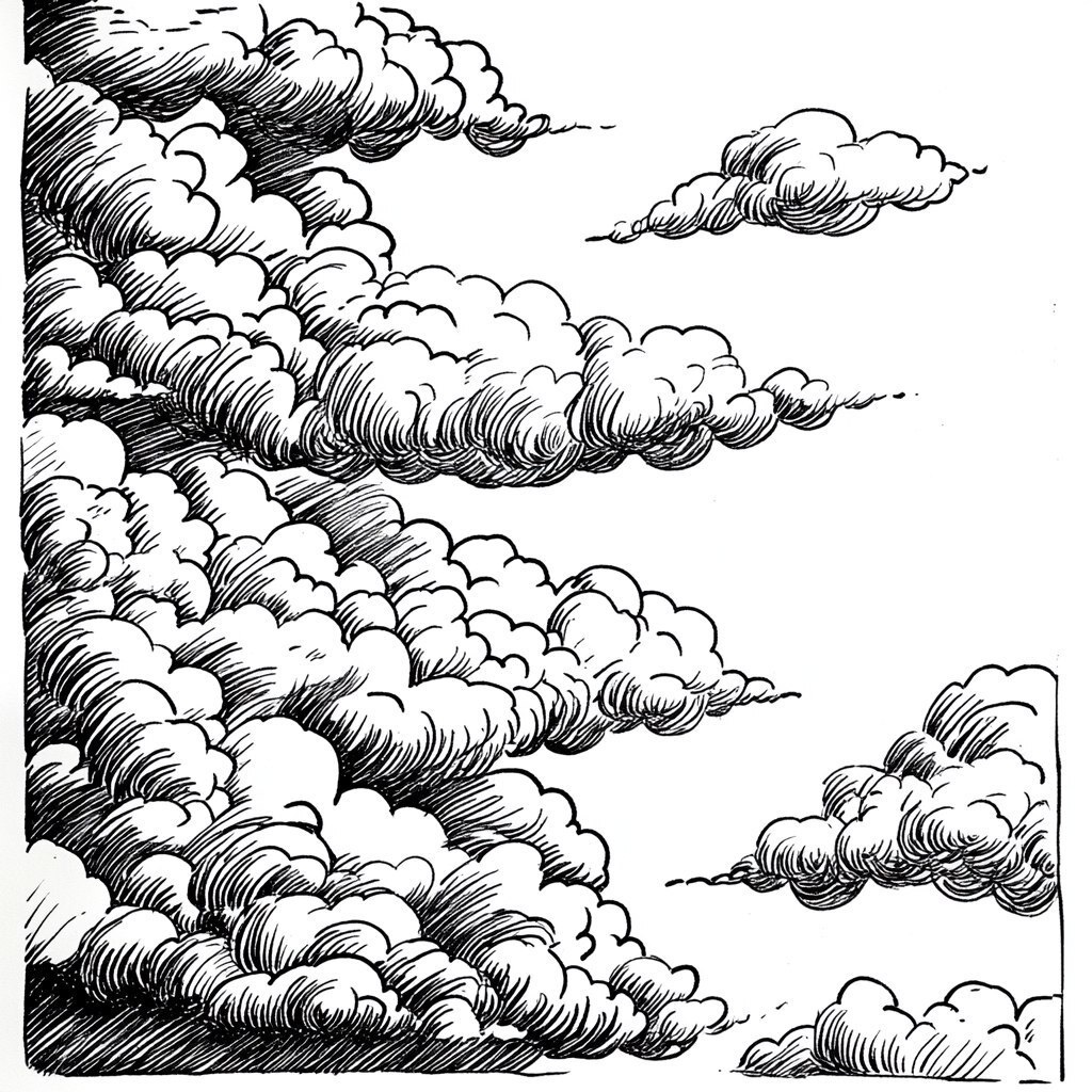 Создано на основе запроса: little clouds in the style of Dürer Linogravra, thick lines, on a white background