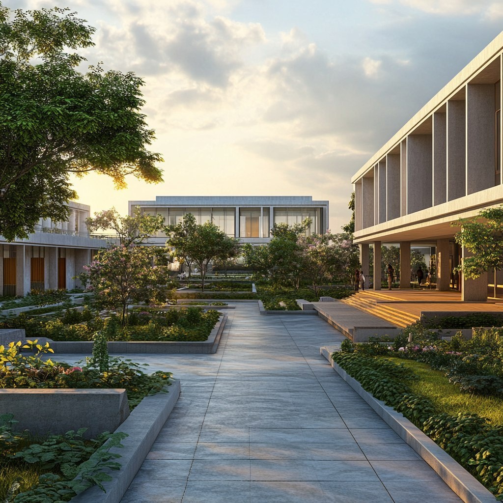 Создано на основе запроса: urban public building in india with landscapes walking tracks