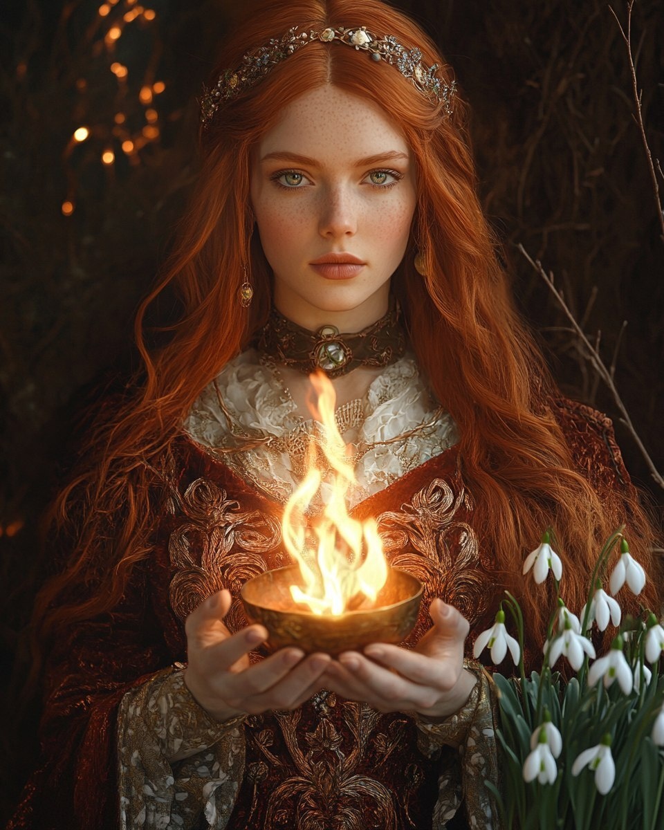Создано на основе запроса: Brigitte - Celtic goddess of fire, crafts and inspiration, beautiful red-haired woman in rich Celtic clothing holding fire in her hands, Imbolc, snowdrops nearby, photoportrait --- Автоперевод: Бриджит - кельтская богиня огня, ремесла и вдохновение, красивая красная женщина в богатой кельтской одежде, держащей огонь в руках, imbolc, подснежники поблизости, Photoportrait Хорошо выглядит? 🤔 https://dzen.ru/id/65c0c65c86e4f837c27b24d7 #ИИ #AI #нейросеть #midjourney #art