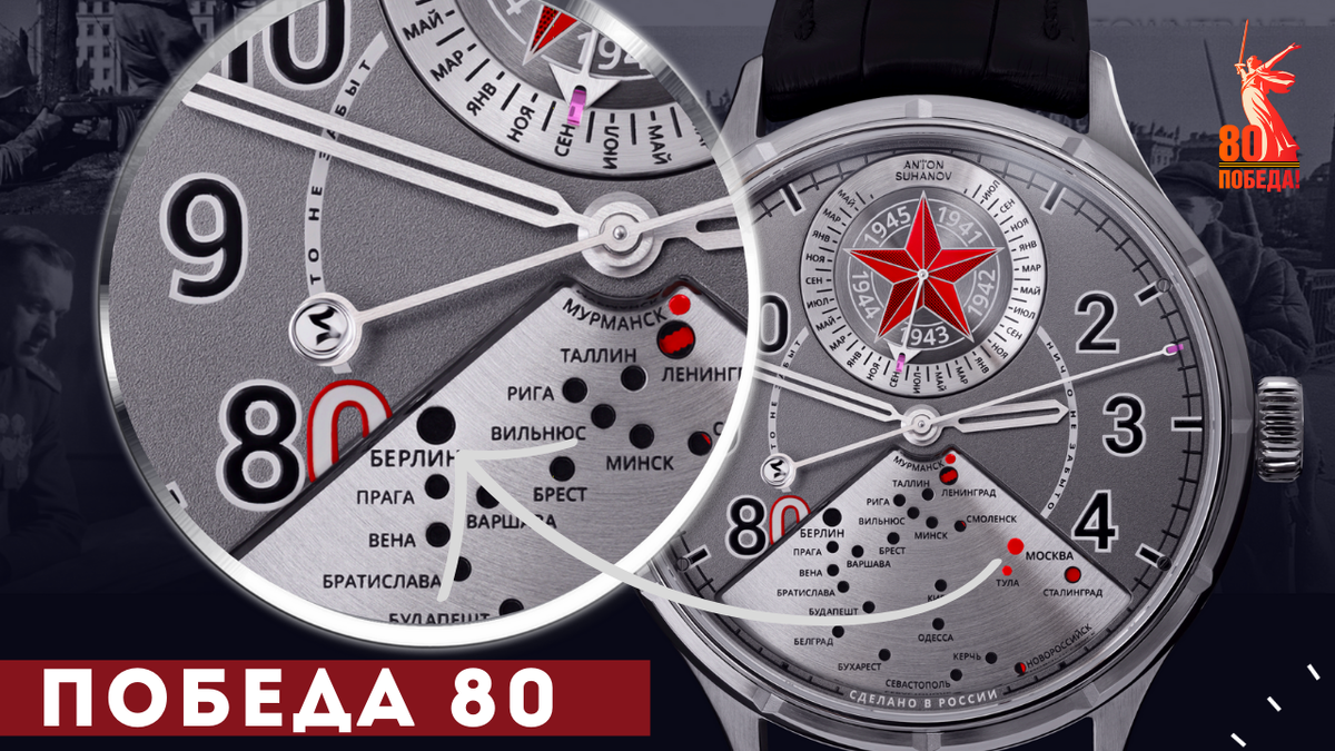 Эти часы определённо войдут в топ лучших часов России за всю историю! Победа 80. Антон Суханов. Не просто сложные часы, не просто новое усложнение и высокое часовое исскуство, а часы со смыслом, который понятен каждому. В этом году мы отмечаем 80 годовщину великой победы. Конечно, многие часовые компании создавали свои модели к этой дате, но часы Суханова смогут рассказать историю объединяя время и место. Помните недавние часы Хронотоп? Да, связь этих двух моделей прослеживается, и не только во внешнем облике но и в некой философии. Впервые в наручных часах наглядно представлена хронология событий в конкретный период времени Нижний сектор циферблата занимает схематичная карта боевых действий, которые велись на территории СССР и европейских стран, на нее нанесены 13 советских городов-героев и 11 европейских столиц, а рядом с названием города расположена аппертура с переменным цветовым обозначением. Цвет меняется в течении в течении времени. Черный означает, что город находится под ко
