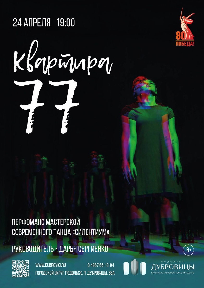 ✨ Пластический перформанс «Квартира 77» 🌟Расскажем зрителям о том, как люди проживали жизнь в годы Великой Отечественной войны, в один из самых важных периодов нашей истории. 💃Непрерывный поток мысли перенесет зрителя в коммунальную квартиру Анны Ахматовой и сделает на время её жильцами. ⏳Продолжительность – 1 час 🚫 Возраст: 6+ 📆 24.04.2025 🕒 19:00 🏢 Культурно-просветительский центр "Дубровицы" 📍 г.о. Подольск, поселок Дубровицы, д. 65А 💰 Вход свободный❗️ #webПодольск ✅ Мероприятия Подольск https://dzen.ru/id/66ed500f7b5671493eca3fd6 http://vk.com/podolsk_events http://dzen.ru/podolsk_events