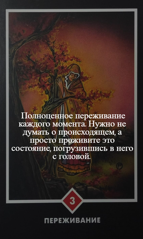 «Переживание» опыта — это чувство удивления, трепет единения, нежное прикосновение и ощущение нашей связи со всем, что нас окружает. Женщина на карте находится в единении с деревом, она почти стала с ним одним целым. Природа может поделиться с нами многими секретами. Если хотите научиться прислушиваться к подсказкам, то нужно уметь выключать ум и полноценно погружаться в события. Подключайте все органы чувств, чтобы наблюдать, слушать, чувствовать, осязать и переживать.