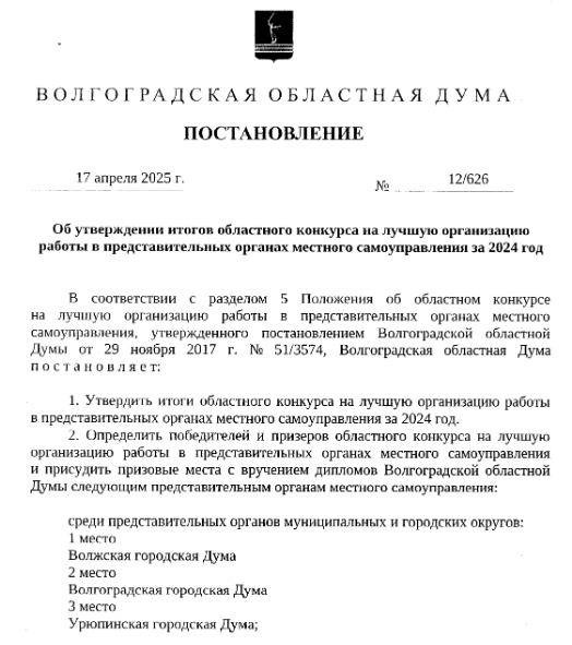 Волгоградская областная Дума подвела итоги конкурса на лучшую организацию работы в органах местного самоуправления в 2024 году. Среди городских округов первое место заняли депутаты Волжской городской Думы. Вот, где слуги народу трудились на славу! Волгоградская гордума уступила коллегам из города-спутника и расположилась на втором месте. Бронзы удостоились депутаты из Урюпинска. Также облдумцы оценили и работу слуг народа муниципальных районов. На первом месте оказались депутаты из районных Дум Николаевского и Среднеахтубинского районов. На втором — Клетская, Ольховская, Старополтавская Думы. Третье — Дубовская, Калачевская и Чернышковская Думы.