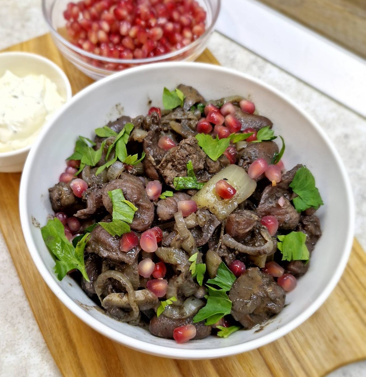 Кучмачи — это блюдо грузинской кухни, которое готовят из потрохов, с добавлением граната, кинзы и пряностей. Давайте и мы с вами приготовим эту наивкуснейшую горячую закуску! Для приготовления нам понадобится: Потрошки тщательно моем и разрезаем на кусочки (сердечки я оставляю целыми). Затем выкладываем сердечки с желудками на сковородку, вливаем 2 ст. л. растительного масла и обжариваем примерно 5-7 минут на среднем огне. Солим, перчим, добавляем 50 мл. вина и 200 мл. горячей воды из чайника, тушим под крышкой на небольшом огне 40 минут. Добавляем куриную печень и тушим еще минут 10. Лук очищаем от кожуры, режем полукольцами и обжариваем на отдельной сковороде на 4 ст.л. растительного масла до готовности. Не забываем немного посолить и поперчить. Чеснок пропускаем через пресс, красный острый перец очищаем от семян и мелко рубим, смешиваем всё это в отдельной пиале с сухими специями и вливаем остатки вина, всё тщательно перемешиваем. Гранат очищаем и складываем зернышки в отдельную ем