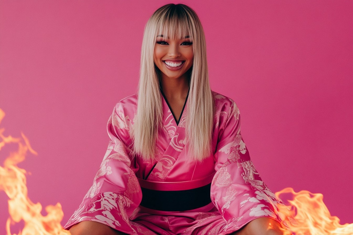 Создано на основе запроса: a beautiful mixed race woman with straight blonde hair with a blunt fringe smiling while sitting on a plank that is on fire. She is wearing a pink kimono with a black belt. pink background --- Автоперевод: Красивая смешанная гонка с прямыми светлыми волосами с тупой бахромой, улыбающейся, сидя на доске, которая в огне. Круто получилось? 🤔 https://dzen.ru/id/65c0c65c86e4f837c27b24d7 #ИИ #AI #нейросеть #midjourney #art