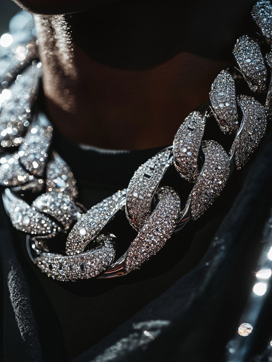 Создано на основе запроса: A close-up, high-fashion 90s hip-hop album cover-style photograph with cool tones and gritty, flat lighting of several oversized, iced-out chains on a person. The chains are bold, heavy, and sparkling with large diamonds, reflecting streetwear vibes. The lighting is raw and slightly harsh, creating shadows that add intensity to the image. The composition is gritty, with a bold, clean framing inspired by 90s hip-hop album art, emphasizing power, wealth, and street culture. --- Автоперевод: Крупный план, высокомодный 90-х, хип-хоп-альбом, фотография в стиле обложки с прохладными тонами и песчаным, плоским освещением нескольких негабаритных цепочек для человека. Как тебе этот вариант? 🤔 https://dzen.ru/id/65c0c65c86e4f837c27b24d7 #ИИ #AI #нейросеть #midjourney #art