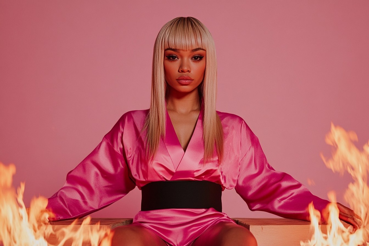 Создано на основе запроса: a beautiful mixed race woman with straight blonde hair with a blunt fringe looking shocking while sitting on a plank that is on fire. She is wearing a pink kimono with a black belt. pink background --- Автоперевод: Красивая смешанная гонка с прямыми светлыми волосами с тупой бахромой шокирующей, сидя на доске, которая в огне. Как тебе такой вариант? 🤔 https://dzen.ru/id/65c0c65c86e4f837c27b24d7 #ИИ #AI #нейросеть #midjourney #art