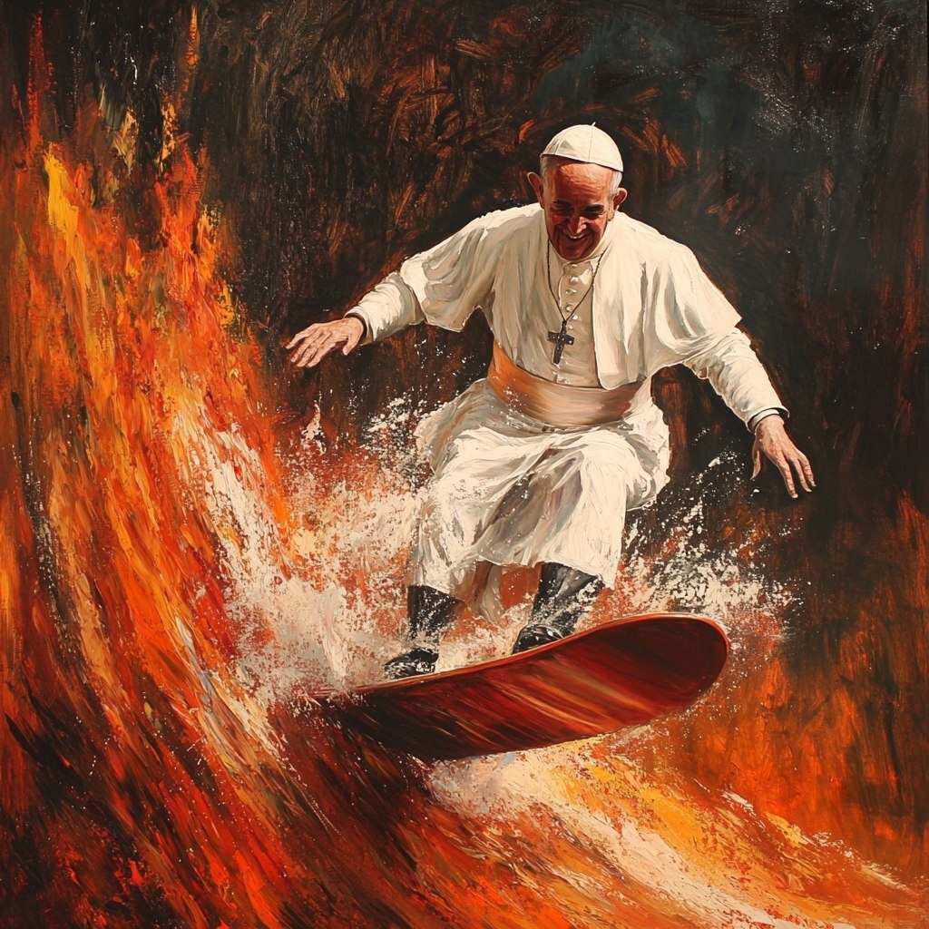 Создано на основе запроса: Pope surboarding through Hell, action shot, oil painting