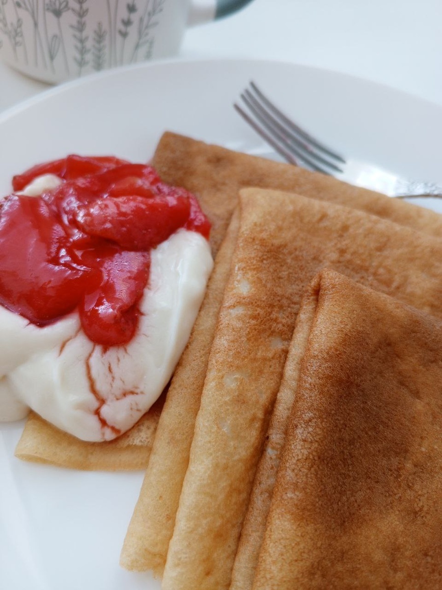 Блинчики с заварным кремом и клубникой. Заварной крем можно посмотреть выше, где пирог с иргой. Или купить в пакетике и заварить. Ягода любая, блины по вашему любимом рецепту. Не завтрак, а праздник! Готовьте с удовольствием!