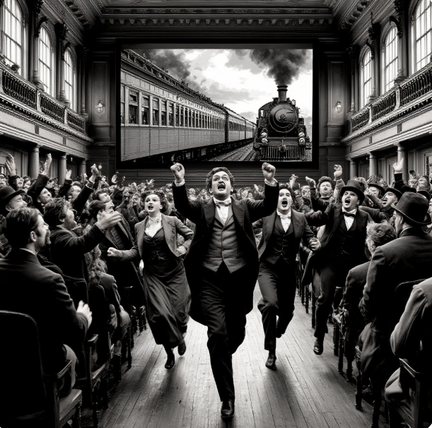 Когда на экране появился паровоз, мчащийся прямо на публику, зал взорвался от ужаса: дамы в кринолинах вскакивали с мест, мужчины заслоняли их руками, а один господин даже выбежал на улицу, уверенный, что поезд сейчас вырвется из стены.