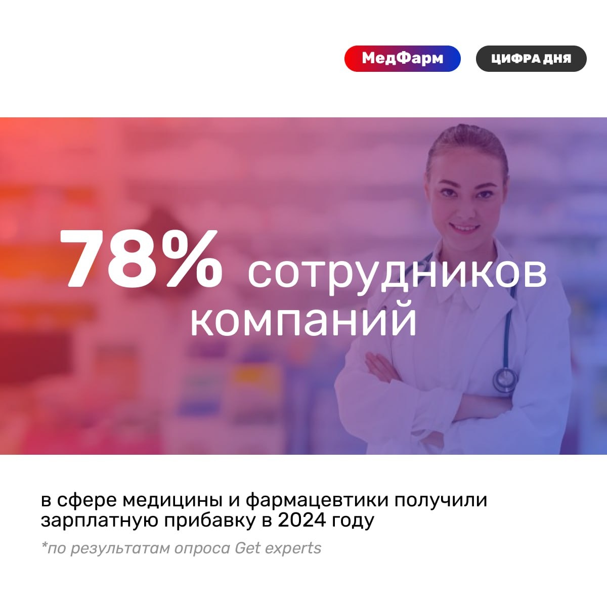 Согласно опросу Get experts, 78% сотрудников компаний в сфере медицины и фармацевтики получили зарплатную прибавку в 2024 году