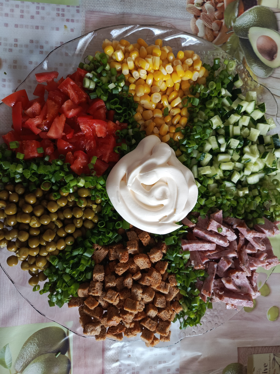 В этот салат можно положить все овощи что вы употребляете, а я положила те что я люблю. нам понадобится: 2 помидора средних 2 огурца средних 100гр. сухариков твёрдых 150гр. колбасы копчёной 180гр. горошка консервированного 180гр. кукурузы консервированной пучок зелени 3-4 столовые ложки майонеза Режем небольшими кубиками помидоры и огурцы, зелень, соломкой нарезаем колбасу. На блюдо выкладываем все ингредиенты, красиво оформляем зеленью, кладём майонез. Овощи посолить. Перед употреблением хорошо вымешать. Приятного аппетита.