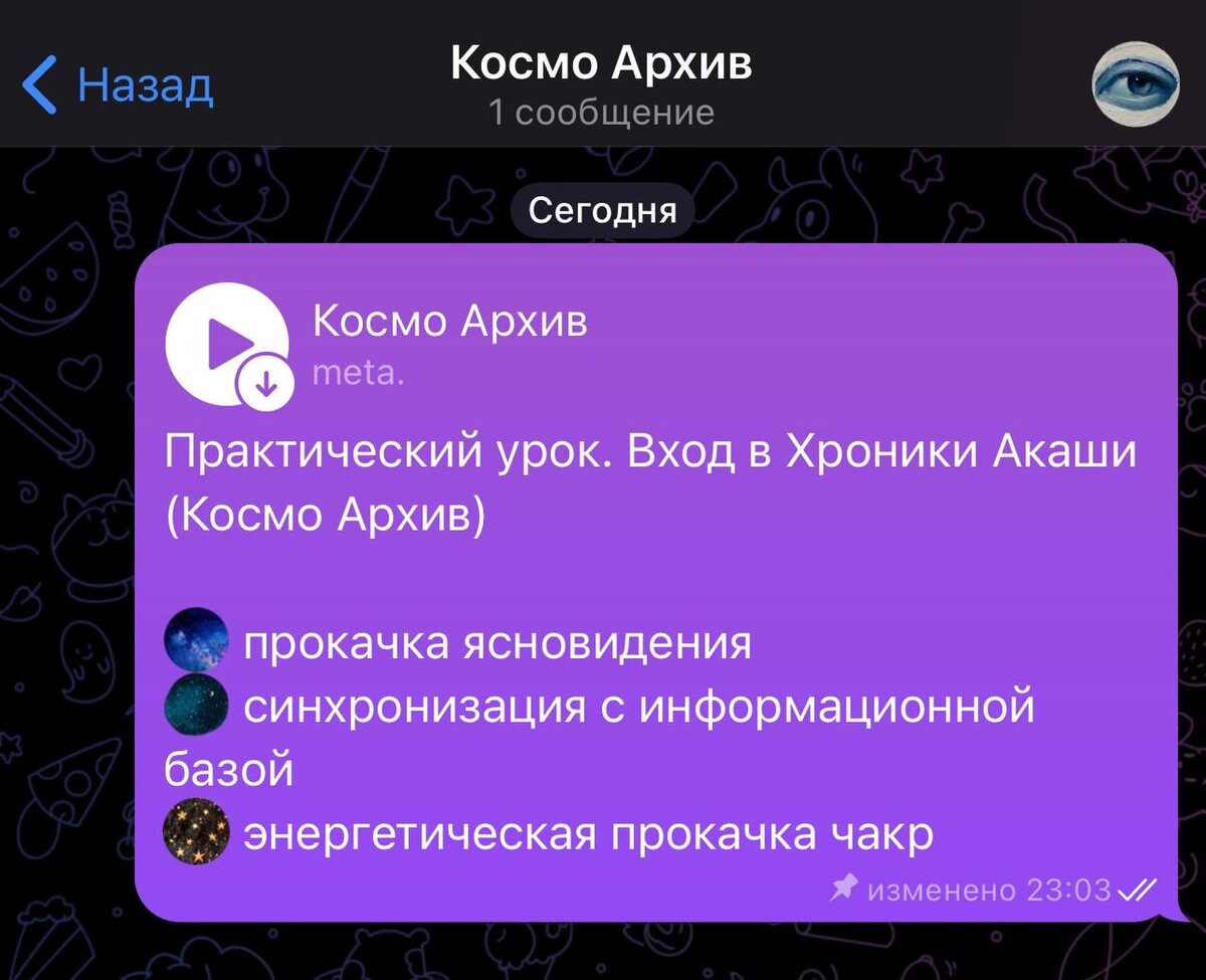 у нас в meta. появился новый раздел «Космо Архив» там будут практические эфиры по Хроникам Акаши если хотите получить доступ к закрытому чату напишите админу @seranmagic