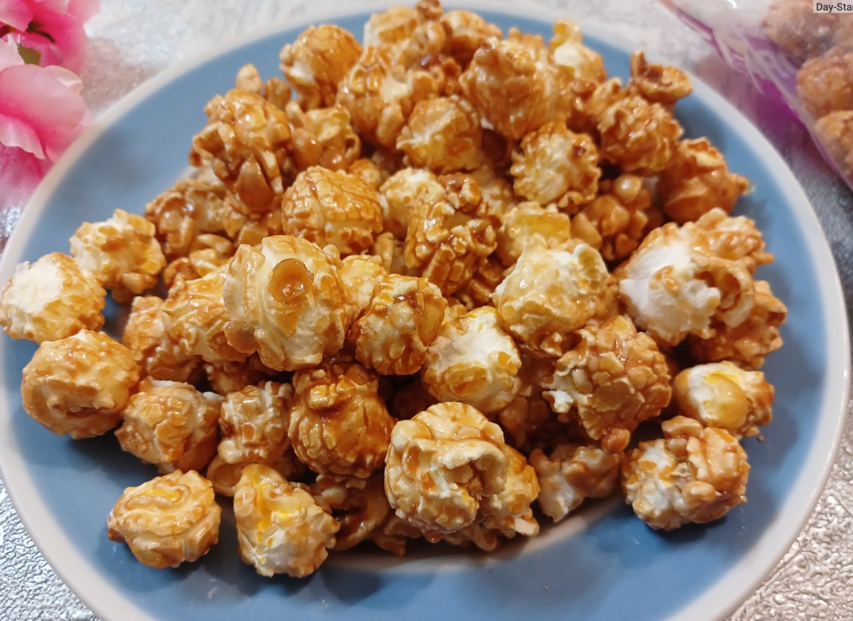 - Карамельный попкорн: Приготовьте карамель (сахар, масло, вода) и полейте ей попкорн.