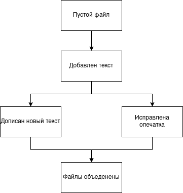Слияние версий — объединение двух и более независимых версий. Для примера выше, слиянием будет объединение двух существующих версий нашего файла в одну — файл, в котором будет и новый текст, и исправленная опечатка.