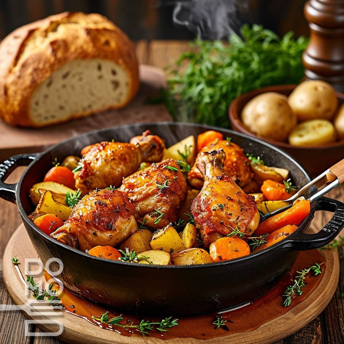 🍗 ЖАРКОЕ ИЗ КУРИЦЫ С КАРТОФЕЛЕМ Ароматное домашнее блюдо с золотистой корочкой. ⏳ Время приготовления: 2 часа (с учетом маринования) 🍽 Порций: 6 🛒 ИНГРЕДИЕНТЫ Основные: - Курица (бёдра/голени) — 1,5 кг - Картофель — 800 г - Морковь — 2 шт. (средние) - Лук репчатый — 2 шт. (крупные) - Сельдерей — 2 стебля Для жарки/тушения: - Масло топлёное — 2 ст.л. - Бульон куриный — 700 мл Ароматические добавки: - Лавровый лист — 3 шт. - Тимьян свежий — 3 веточки - Петрушка — 1 пучок (~20 г) - Соль, перец — по вкусу 👩 ПРИГОТОВЛЕНИЕ 1️⃣ Подготовка: 1. Курицу посолите, оставьте на 30-40 минут. 2. Овощи нарежьте: - Картофель — крупные дольки - Морковь — кубики 2 см - Лук — тонкие полукольца - Сельдерей — ломтики 5 мм 2️⃣ Обжарка: 1. Разогрейте масло в казане. 2. Обжарьте курицу партиями до румяности (по 5 минут с каждой стороны). 3. Обжарьте лук 5 минут, добавьте овощи — ещё 5-7 минут. 3️⃣ Тушение: 1. Верните курицу, влейте бульон, добавьте специи. 2. Тушите 1 час под крышкой на слабом огне
