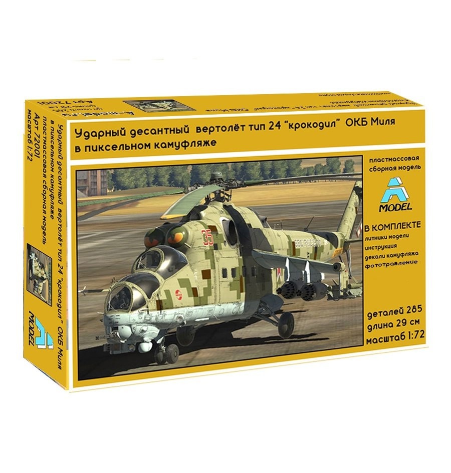 A-model из Электростали перепакует модель Ми-24 в масштабе 1/72 от "Звезды" с собственной декалью пиксельного камуфляжа и фототравлением: Ударный вертолет тип 24 "крокодил" ОКБ Миля в пиксельном камуфляже (каталожный номер 72001)