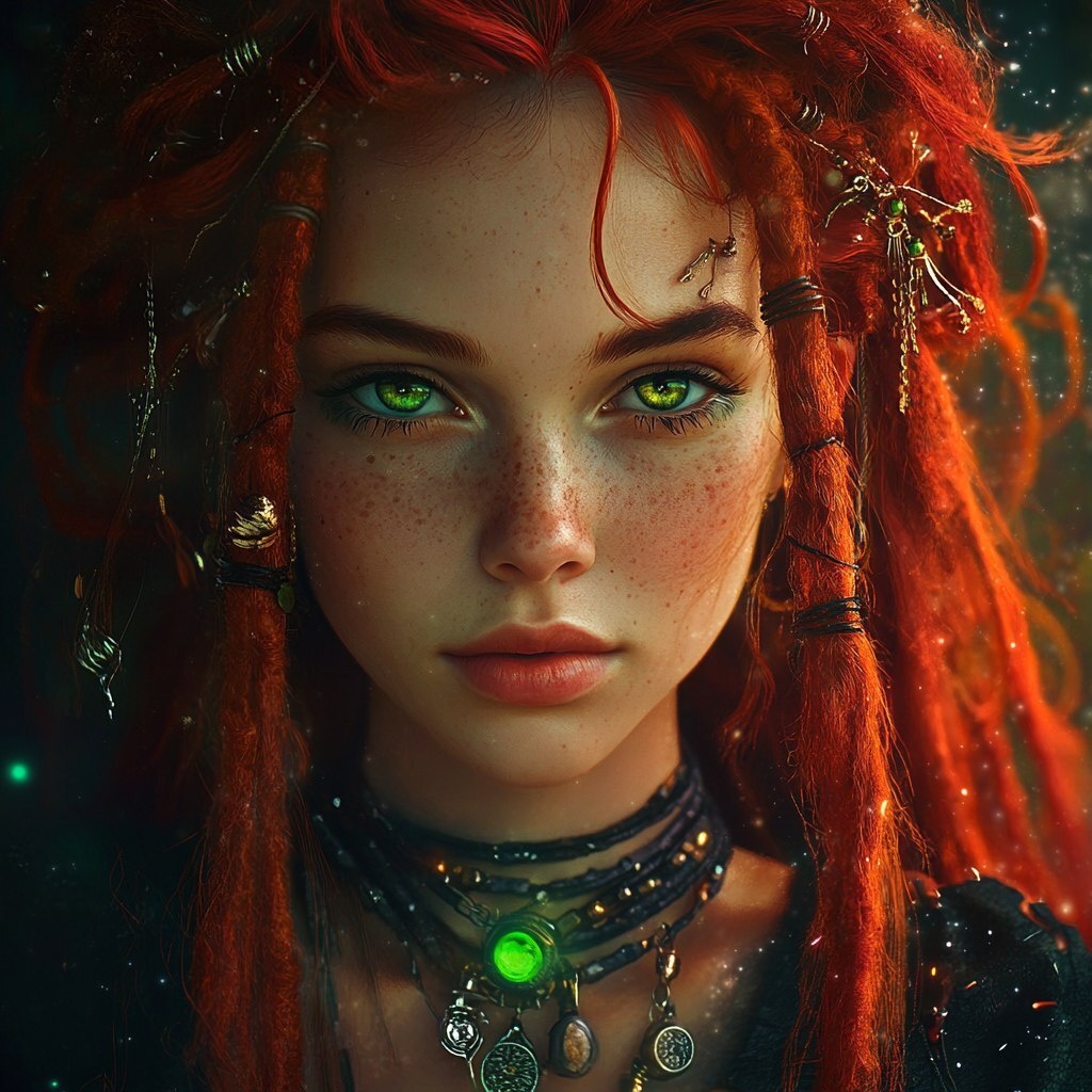 Создано на основе запроса: fantasy portrait of a human woman with glowing emerald green eyes, intense gaze, freckled porcelain skin, a faint sweet smile, fiery red dreadlocks adorned with beads,ribbons, and metal trinkets, necklaces and layered chokers, dark academia and bohemian clothing, mystical atmosphere, softly lit background, high detail,digital art ,cartoon, anime --- Автоперевод: Фэнтезийный портрет человеческой женщины со светящимися изумрудными зелеными глазами, интенсивным взглядом, веснушной фарфоровой кожей, слабой сладкой улыбкой, огненными красными дредами, украшенными бусинами, лентами и металлическими безделушками, ожерельями и слоистыми чокеры, темная академия и бохемская одежда, мистическая атмосфера, мягкая ликова, высокая деталь, цифровая арт, карт, этюма Интересно выглядит? 🤔 https://dzen.ru/id/65c0c65c86e4f837c27b24d7 #ИИ #AI #нейросеть #midjourney #art