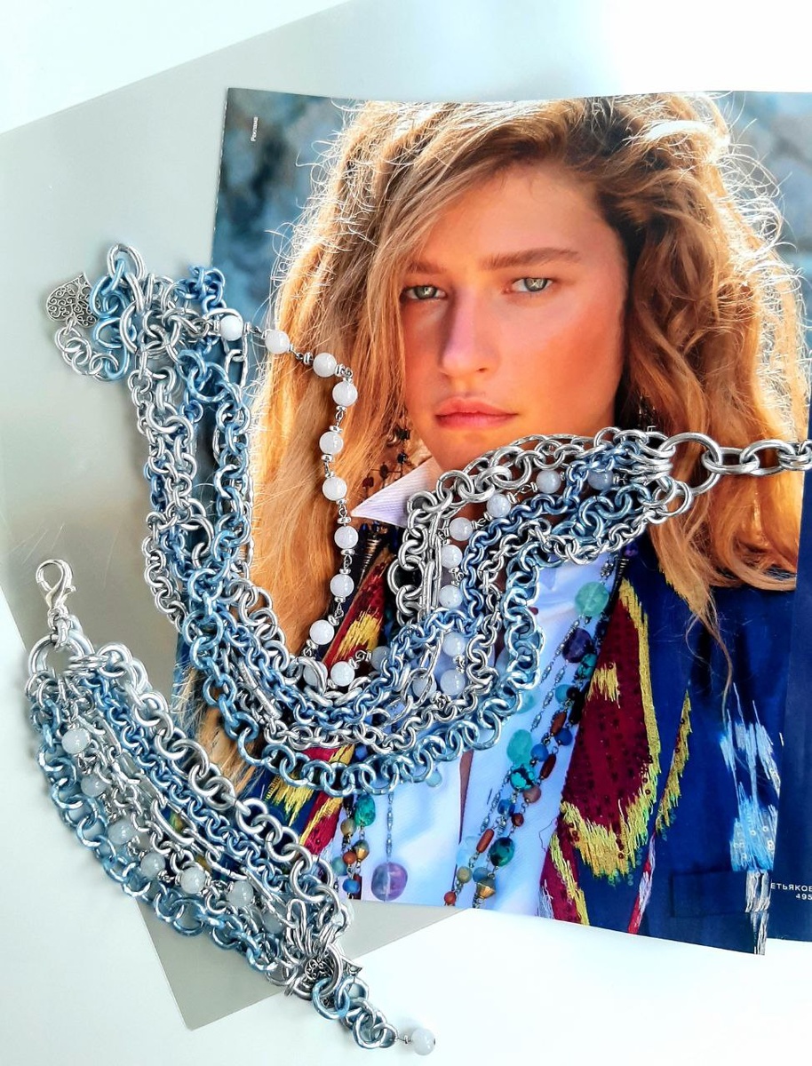 Многорядный Каскад в голубом цвете сочетает в себе все модные тенденции: многослойность и цвет, цепи и камни! 💎⛓💯🔥 Каждая цепь в этом нежно-голубом Каскаде не повторяется и имеет разный размер, форму, текстуру и прекрасно сочетается вместе с изящной аквамариновой дорожкой 💎🌸 Каскад классно смотрится в разных образах и в любое время года 💃🔥💯 Материал: (АА) Анодированный алюминий, аквамарин 🦋 Длина колье регулируется 45 - 55 см Браслет с регулируемой застежкой😊 По запросу - размер сделаем любой 👌 Ручная работа 🔨💯 🌶 Задать вопрос и оформить заказ можно здесь: @ACULA_JW Наш телеграмм канал https://t.me/JW_ACULA