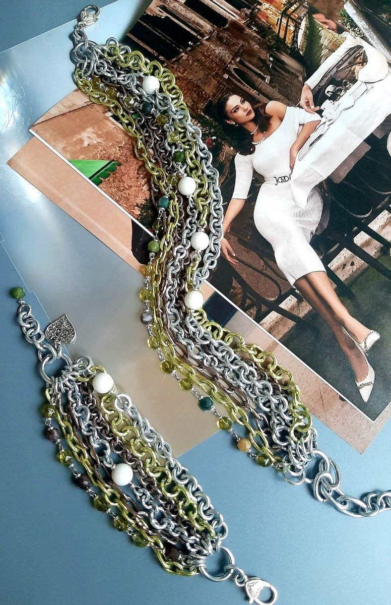 Ещё один Каскад в оливковом цвете 🫒🔥 Нежный и сочный Каскад сочетает в себе все модные тенденции: многослойность и цвет, цепи и камни! 💎⛓💯🔥 Оливковый, древесный, серебристый цвет цепей имеет разный размер, форму и текстуру ⛓🏵 Дорожка из бусин яблочного, оливкового, древесного цвета придает сочности и блеска 🍏💥🫒, а молочные агатовые бусины создают энергию в этом потоке 💥💯💫 Каскад классно смотрится в разных образах и в любое время года 💃🔥💯 Цепи ручной работы из АА !🔨💯 (АА) Анодированный алюминий: лёгкий, модный, гипоаллергенный☘💯🕶 Длина колье регулируется 44 - 50 см Браслет с регулируемой застежкой😊 По запросу - размер сделаем любой 👌 🌶 Задать вопрос и оформить заказ можно здесь: @ACULA_JW Наш телеграмм канал https://t.me/JW_ACULA
