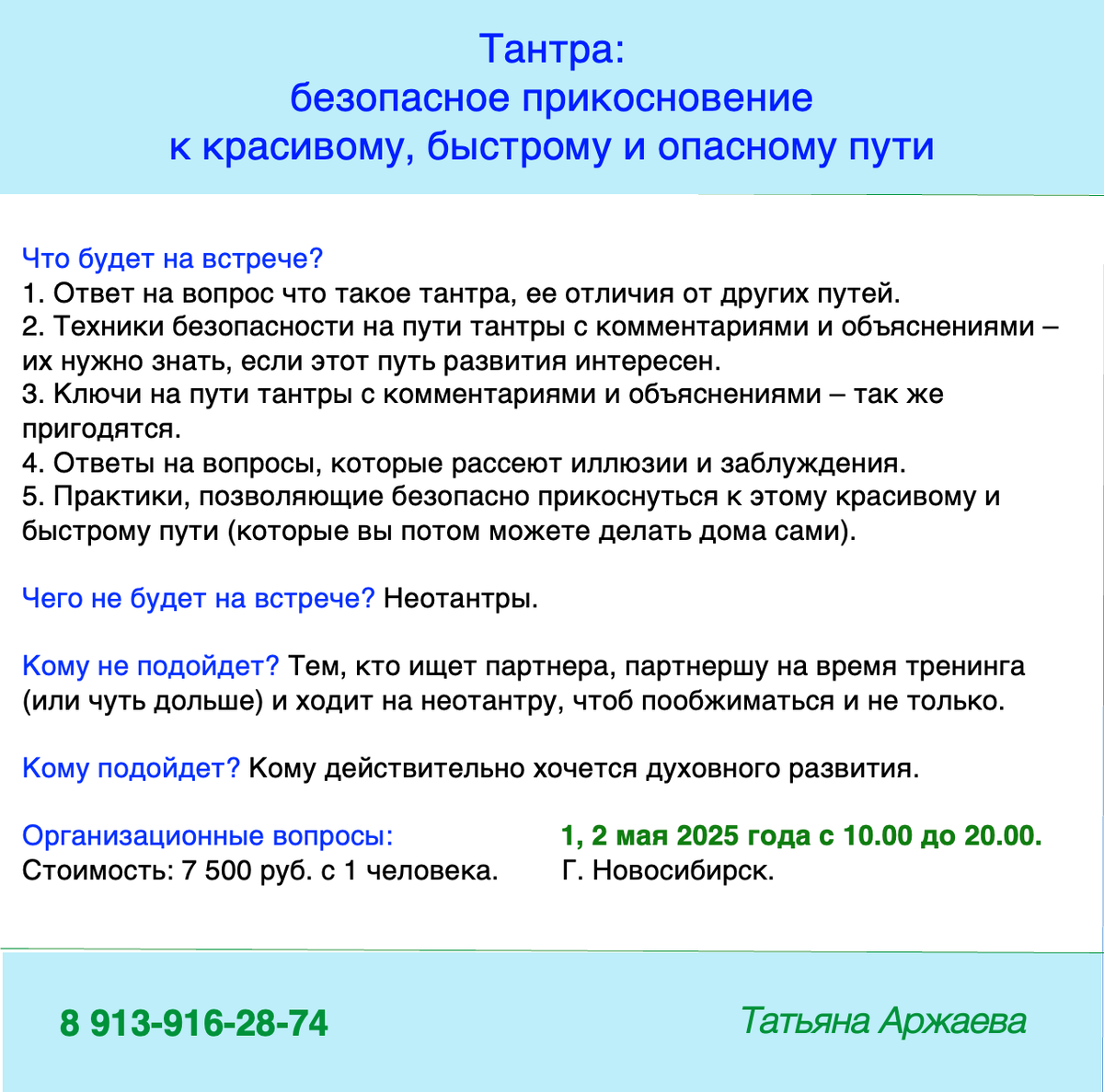 Тантра: безопасное прикосновение к красивому и опасному пути. Тантра – это красивый, быстрый и опасный путь духовного развития. Неотантра – это парные телесно-ориентированные практики с элементами медитаций, йоги, дыхания, а так же с элементами сексуальных практик, в подавляющем большинстве своем к тантре не имеющих отношения. Что будет на встрече?