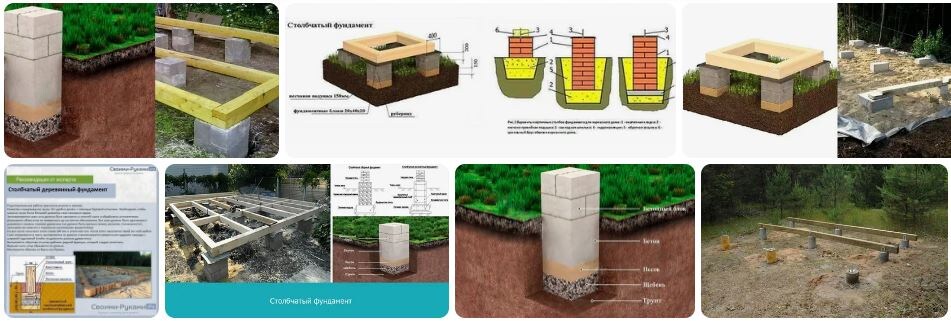 Существует несколько видов данного фундамента, отличаются они материалом изготовления: столбчатый фундамент из труб, из бетона, из бревен, из строительного камня.