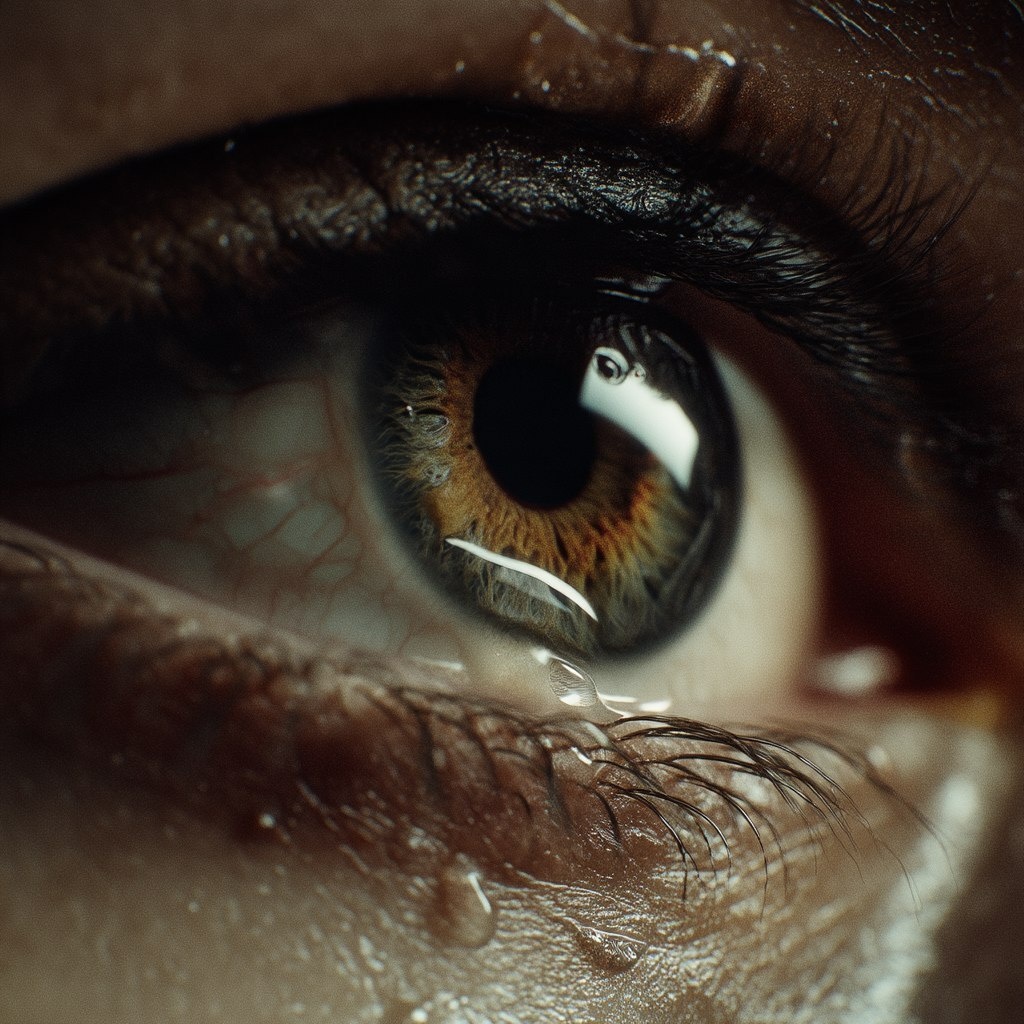 Создано на основе запроса: Extreme close-up of an eye reflecting nostalgic moments, expressing a sad emotion, with tears, created through