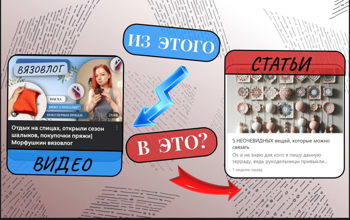 Начнем с того, что у меня видео контент, но так же опыт в написании статей у меня имеется, и некоторые из них выстрелили куда лучше чем видео. Статьи у меня были на тему фильмов, а видео о вязании. Естественно подписчики, приходящие ко мне из-за вязания (а их больше чем подписчики, пришедшие от статей), не читали текст, так как они пришли конкретно из-за видео.