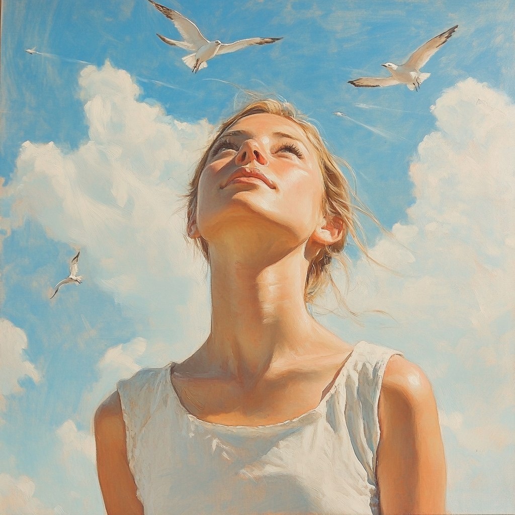 Создано на основе запроса: young woman, full size, light colours, birds in the sky, artistic, paintersque