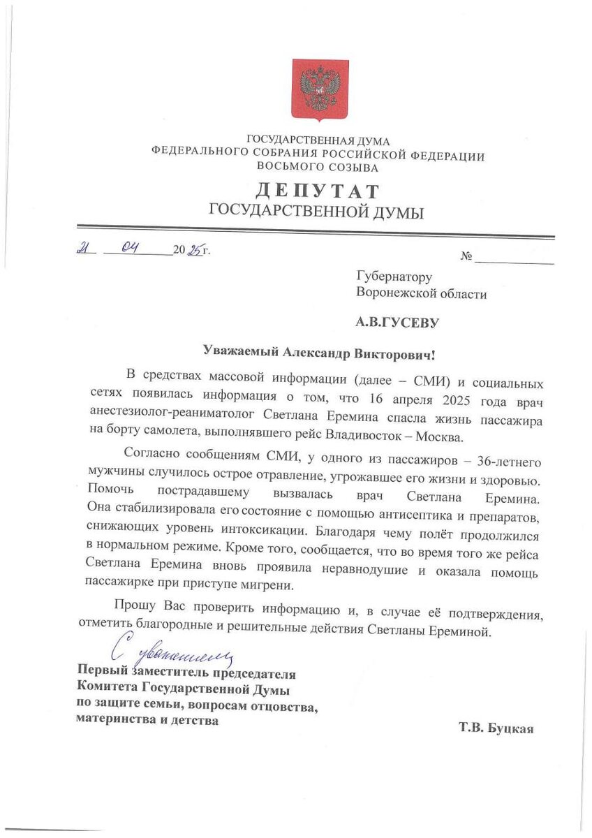 ❗️Врач оказала помощь двум пассажирам авиарейса и тем самым предотвратила экстренную посадку! 16 апреля в СМИ и соцсетях появились новости о том, что врач анестезиолог-реаниматолог во время рейса Владивосток – Москва спасла жизнь человека на борту самолета, а также оказала помощь другому пассажиру. 👉 Сообщается, что у 36-летнего мужчины случилось острое отравление, угрожавшее его жизни и здоровью. Светлана Еремина стабилизировала его состояние с помощью антисептика и препаратов, снижающих уровень интоксикации. 🧑⚕️ Кроме того, во время того же рейса врач анестезиолог-реаниматолог вновь оказала помощь — в этот раз пассажирке с приступом мигрени. Благодаря её действиям состояние пассажиров стабилизировалось, а полет продолжился в штатном режиме. 📨 Я написала обращение на имя губернатора Воронежской области Александра Гусева с просьбой отметить благородные и решительные действия Светланы Ереминой! #Депутат_Буцкая