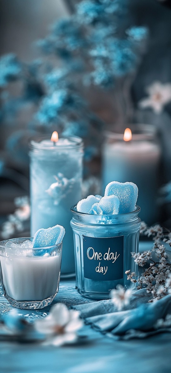 Создано на основе запроса: A blue and white color scheme with "One day" written on the table, there is an ice bucket next to it filled with clear water. There are also some fresh flowers in front of that bucket. On top of them lies a handkerchief and two scented candles. The candles have a soft light effect. One glass cup contains milk tea, while another one holds frozen lollipops. In the background, you can see some wildflowers. --- Автоперевод: Синий и белая цветовая схема с «однодневным», написанным на столе, рядом с ней есть ледяное ведро, заполненное прозрачной водой. Круто выглядит? 🤔 https://dzen.ru/id/65c0c65c86e4f837c27b24d7 #ИИ #AI #нейросеть #midjourney #art