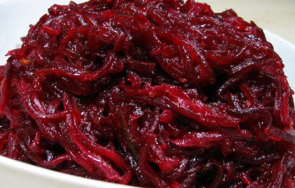 1. Свеклу вымыть, очистить, натереть на терке. Сложить в кастрюлю, залить небольшим количеством воды и варить на медленном огне до готовности. 2. Сильно разогреть растительное масло, вылить в него уксус, положить все специи. 3. Добавить очищенный и измельченный чеснок 4. Все перемешать с отжатой свеклой и оставить на сутки в холодильнике. Ингредиенты: Приятного Аппетита!