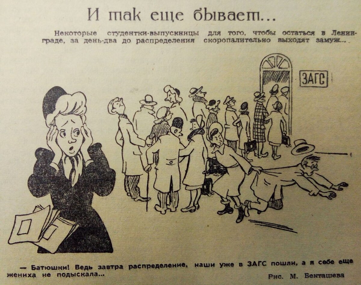 Пожилая и опытная коллега, поработавшая инженером еще в славные «застойные» времена как-то рассказала о том, что в советское время среди студенток считалось «модным» выходить замуж не позднее чем на 4 курсе, потому что тогда (в конце семидесятых) вообще раньше женились и замуж выходили. А кроме того, несмотря на то, что главным для молодых девчонок, конечно же, была любовь, свою роль в стремлении пораньше определиться с поисками «принца на белом коне» играла такая меркантильная тема как распределение. Ведь если живешь в общежитии, но вышла замуж и муж с местной пропиской, например, в Москве или Ленинграде, да даже пусть и в Рязани или в Туле, то с большой вероятностью получишь место для работы в этом же городе. Ну а если останешься к моменту получения диплома молодой, яркой и интересной, но при этом одинокой – то даже без цыганки можно нагадать молодой специалистке «казенную дорогу». Потому что за бесплатное обучение полагалось поработать по распределению. А это не всегда удобно, потом