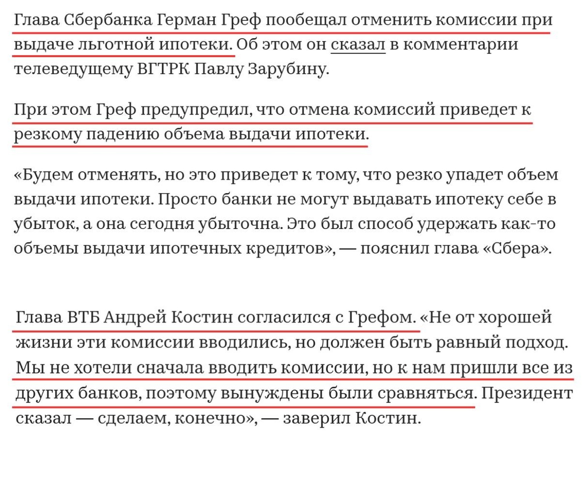 Помните про комиссии, которые нужно было заплатить банку при выдаче льготной ипотеки? Так вот Сбер и ВТБ пообещали отменить их. Новость, конечно, хорошая, но тут есть нюансы. Отмена комиссий может привести к падению объемов ипотеки (банки не могут работать в убыток, а без этих комиссий ипотека для них становится невыгодной) Президент призвал навести порядок в сфере семейной ипотеки и заявил, что многие семьи избегают ипотеки, потому что эти дополнительные 5-10% — вообще перебор. Комиссии — это не прозрачно и увеличивает стоимость жилья. Что из этого важно для нас? 1) Комиссии уберут, но это не значит, что ипотека станет супердешевой. Уменьшение скрытых расходов — это плюс, но первый взнос может вырасти. 2) Банки, чтобы не работать в убыток, возможно, перейдут на выдачу только комбинированных ипотек — это когда кредит больше 12 млн: часть выдается под 6%, другая часть — под рыночную ставку, в итоге получается средневзвешенная ставка от 9% 3) Цены на жильё могут подниматься. Даже если к