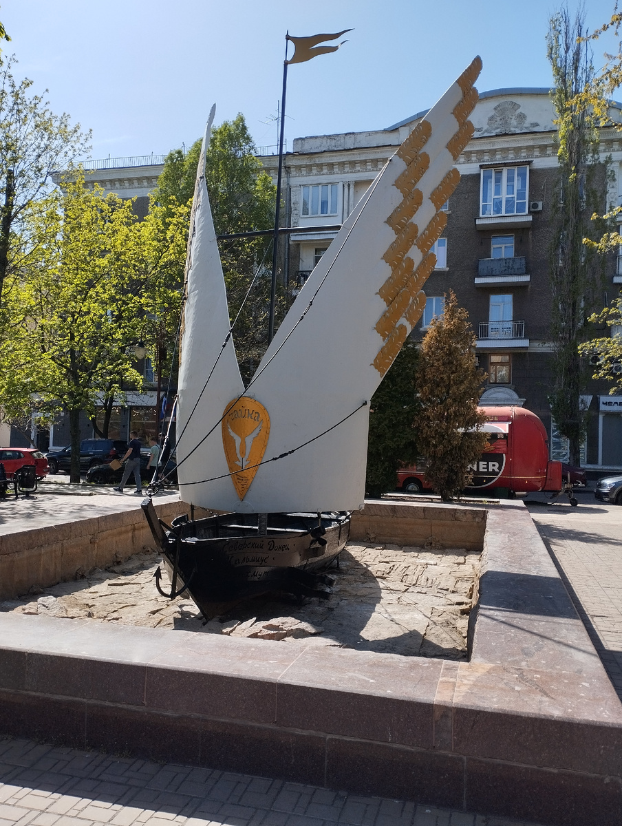 День очень солнечный. В такую погоду особенно хорошо смотрится в окружении свежей листвы скульптурная композиция с лодкой-чайкой. Но она по-прежнему в сухом бассейне. Вода в Донецке уже не первый год по графику. В лучшем случае, потому что всякое случается: