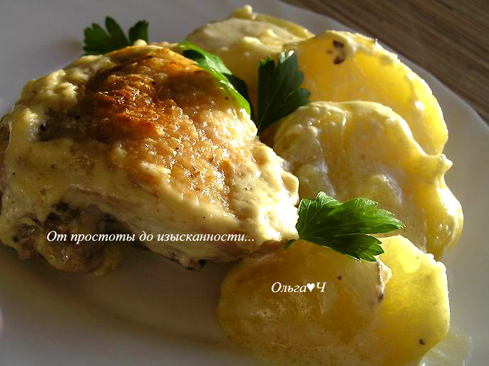 1-2 ч. л. горчицы Приготовление: Курицу посолите, поперчите, обжарьте на растительном масле до румяной корочки, переложите в форму для запекания, смазанную маслом. Картофель очистите, нарежьте кружочками, выложите к курице, полейте маслом от жарки курицы, посолите, поперчите. Смешайте сливки, молоко и горчицу, нагрейте до 60-80*С, залейте в форму. Форму поставьте в духовку, разогретую до 180*С, на 40-45 минут до готовности. Приятного аппетита! Вам также могут понравиться: