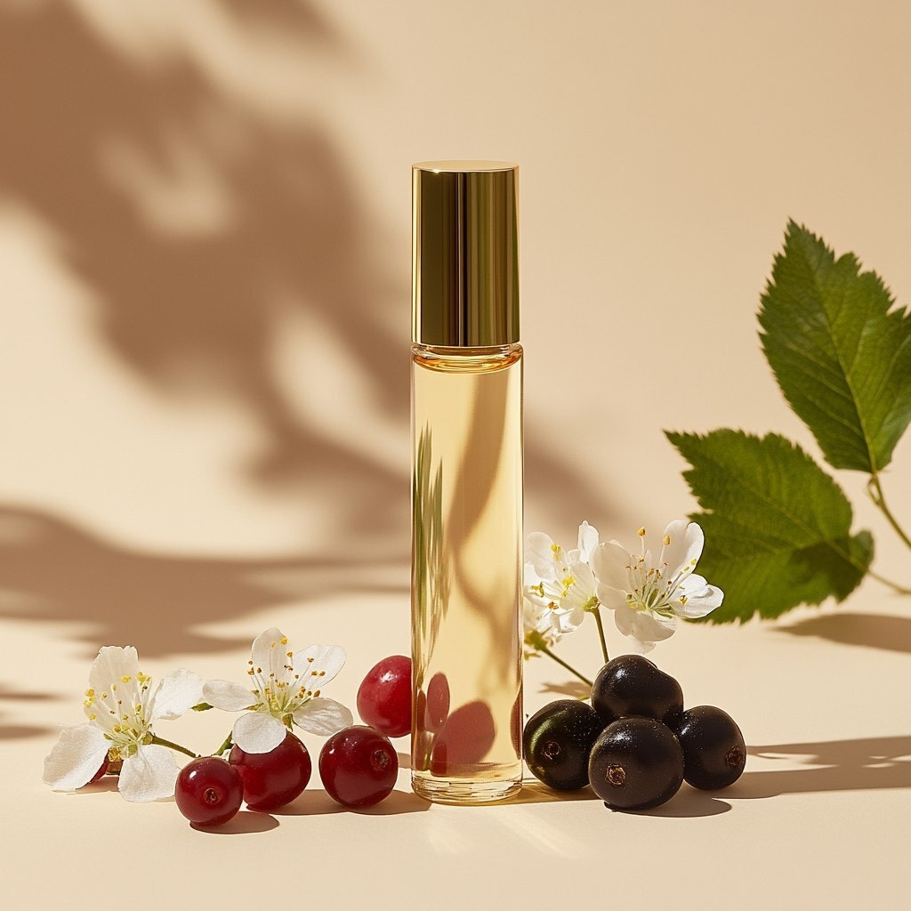 Создано на основе запроса: Product photography of an amber glass roller bottle with a gold lid. The cap fits the whole bottle's circumference, filled with light gold oil perfume liquid. The bottle is surrounded by blackcurrant and cherry. There are also jasmine and rose flowers. All set against a beige background in a minimalistic style with warm tones. Image taken in the desert. Minimalist style with neutral tones, soft lighting, and high resolution. High-resolution image shot with a Canon EOS R5