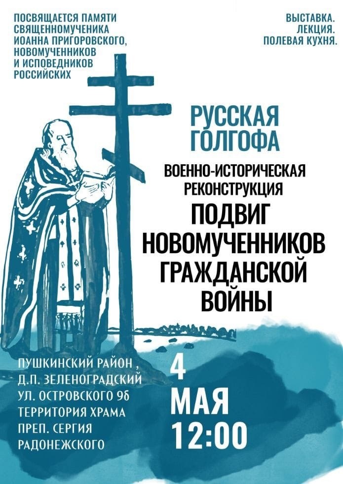4 мая 2025 года, в день памяти новомученика Иоанна Пригоровского, пресвитера Незамаевского, в Пушкинском г.о. состоятся лекция и выставка «Русская Голгофа», посвящённая подвигу новомучеников и исповедников Русской земли. Священномученик Иоанн Пригоровский – чтимый святой подворья Свято-Троице Сергиевой лавры в пос. Зеленоградский Пушкинского г.о. Место проведения: территория храма преподобного Сергия Радонежского пос. Зеленоградский Начало в 12:00 Лекцию проводит прихожанин храма, историк Алексей Конопатченков. После лекции на подворье состоится небольшая военно-историческая реконструкция, посвящённая памяти священнослужителей и мирян, отдавших жизнь за Христа на Донской и Кубанской земле в период Гражданской войны.