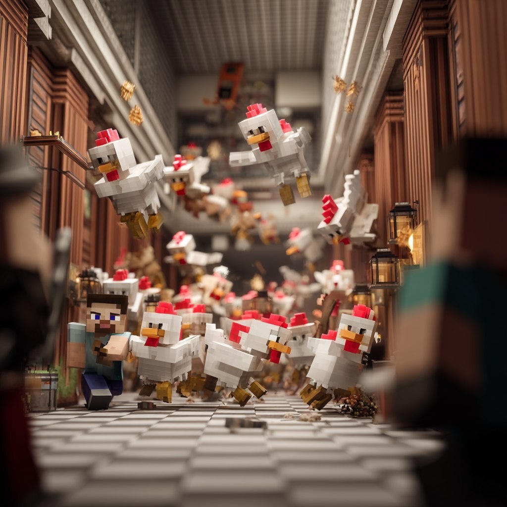 Создано на основе запроса: A mob of Giant Chickens going insane inside a movie theater, people flee in pani, photo sighting from Minecraft