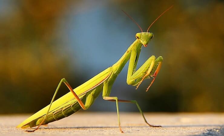 Помогают в охоте большие глаза и подвижная гибкая шея. Богомол известен своим аппетитом. Его основной корм – другие насекомые, но крупные виды могут нападать и на ящериц, лягушек и даже мелких птиц. Да и своими сородичами самка не гнушается перекусывать. Правда, это вовсе не норма их жизни, да и в период совокупления не всегда происходит.