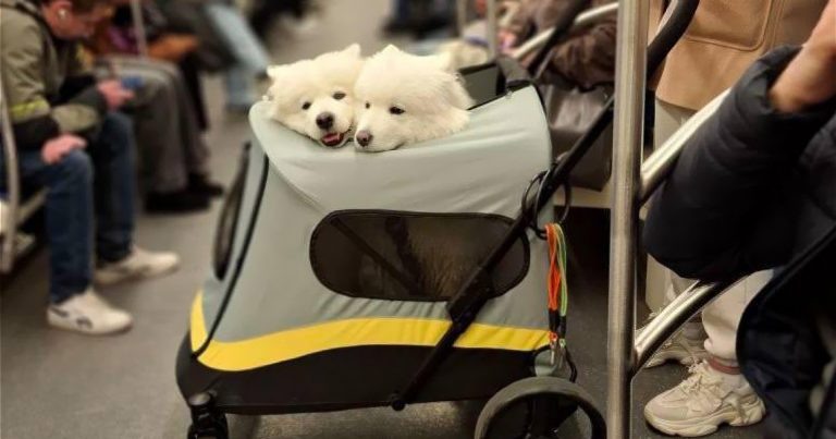 Фото дня: пассажирка метро с коляской с двумя самоедами