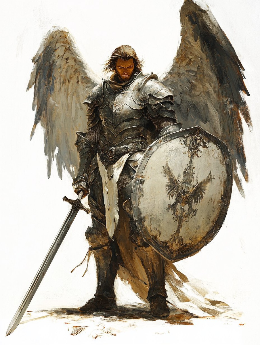 Создано на основе запроса: A fallen seraph angel in plate armor with wings and holding a large sword and shield, isolated on white