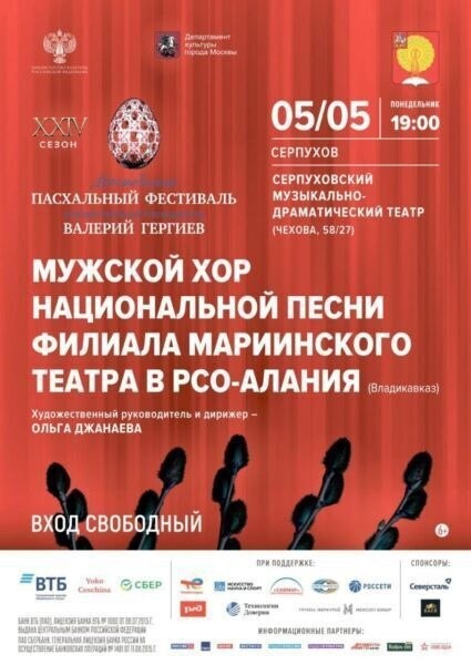 Мужской хор национальной песни из Владикавказа выступит в Серпухове 5 мая в Серпуховском музыкально-драматическом театре выступит Мужской хор национальной песни филиала Мариинского театра в РСО-Алания (Владикавказ) под управлением Ольги Джанаевой. Концерт пройдёт в рамках XXIV Московского Пасхального фестиваля под руководством Валерия Гергиева при поддержке Правительства Москвы, Министерства культуры Российской Федерации и с благословения Святейшего Патриарха Кирилла. В этом году программа фестиваля посвящена 80-летию Победы и 185-летию П.И. Чайковского. \Вход свободный, приходите с семьей и друзьями.