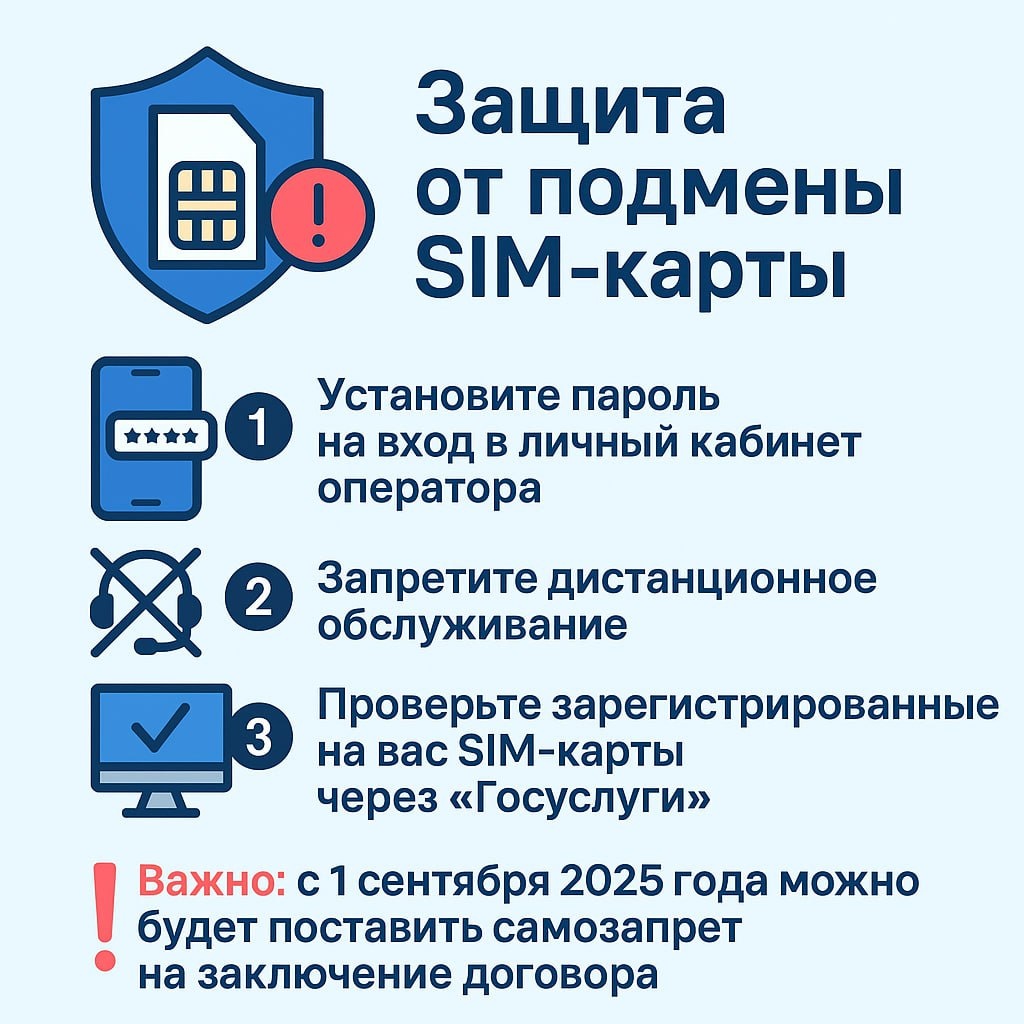 🛡 Как защититься от подмены SIM-карты 🛡 Подмена SIM — это не чужие истории, а про вас. Мошенники уже получают дубликат вашей SIM и заходят в банки, мессенджеры и соцсети. А что делаете вы для защиты? Что делать прямо сейчас: 1️⃣ Поставьте пароль на личный кабинет оператора. По умолчанию используется только Mobile ID (автоматический вход без пароля). Установите полноценный пароль в приложении или на сайте. 2️⃣ Запретите дистанционное обслуживание. Это не позволит без вас перевыпустить SIM-карту. Инструкции: Билайн — с паспортом в салон или звонок на 0611. Теле2 — через личный кабинет, приложение или команда 1562#. МегаФон — только личный визит в салон с паспортом. МТС — установите кодовое слово при личном визите. 3️⃣ Проверьте свои SIM-карты через «Госуслуги». Проверьте, какие номера оформлены на ваше имя 👉 сервис проверки на Госуслугах. ‼️ Важно: с 1 сентября 2025 можно будет поставить самозапрет на заключение новых договоров мобильной связи через «Госуслуги». Также используй