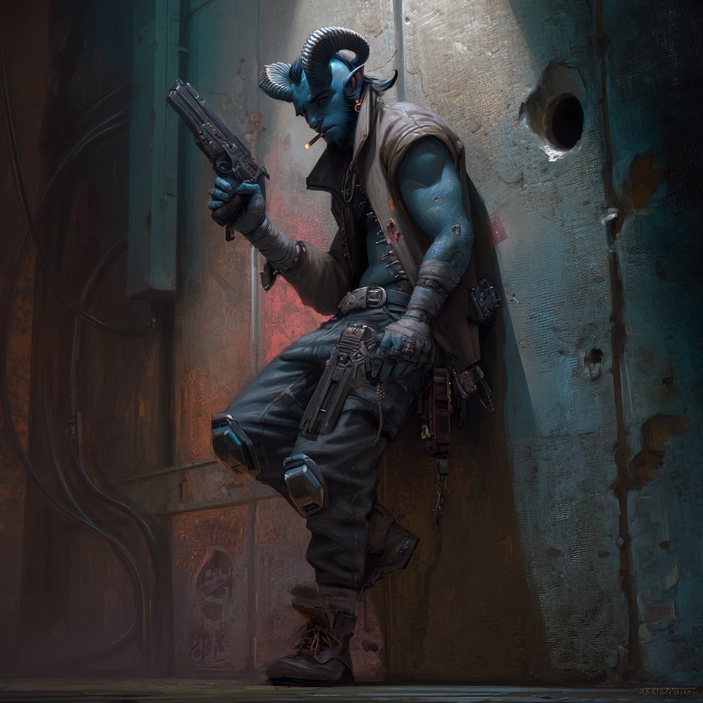 Создано на основе запроса: Shadowrun character, Cyberpunk vibes, Shadowrun vibes, A tech-noir character, a Tiefling mercenary, blue skin