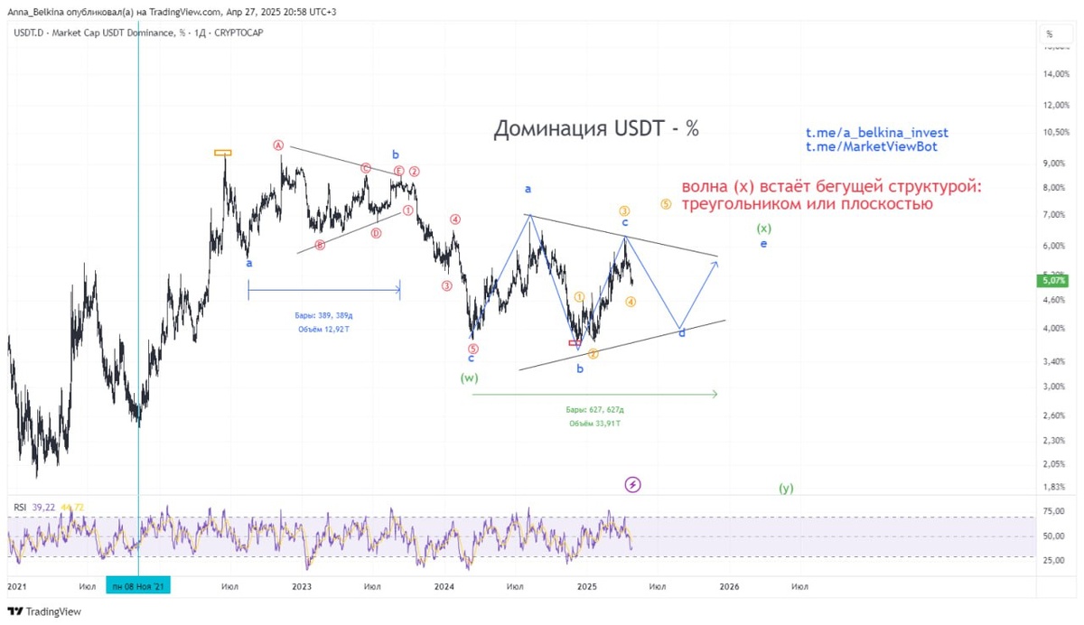 #Доминация_USDT #1D Мы видели, как приободрился крипторынок в последнее время. Этому способствовало снижение доминации по стейблкоинам - участники рынка использовали кэш на кошельках для покупки монет. По доминации USDT - это может быть либо волна d треугольника в промежуточной волне (х) нисходящего ддз. либо волна [4] of c of (x) - это волна (х) бегущая плоскость. Но в целом отмечу, что коррекционное движение здесь не завершено. Поэтому ожидаю сохранения волатильности на крипто активах. Как только доминация пойдет на снижение в волну (y) - тогда мы увидим более активные покупки и рост крипты, соответственно. Не является ИИР
