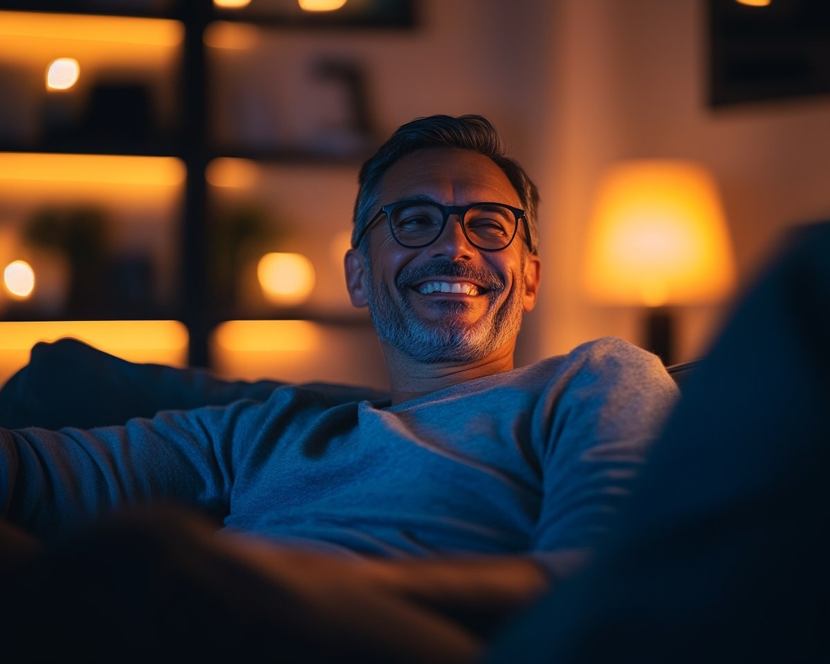 Создано на основе запроса: portrait of a happy father, watching TV, olding remote tv with day lighting in the living room